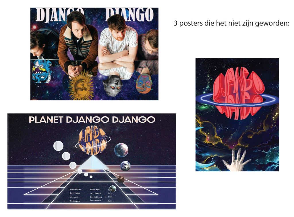 De band Django Django staat voor imperfectie. Het draait bij hen om het lol maken tijdens het spelen en niet om hoe perfect iets wel of niet klinkt. In de campagne wil ik dit sterk terug laten komen in het design van alle uitingen. Het moet er opzettelijk imperfect uitzien, en toch professioneel.